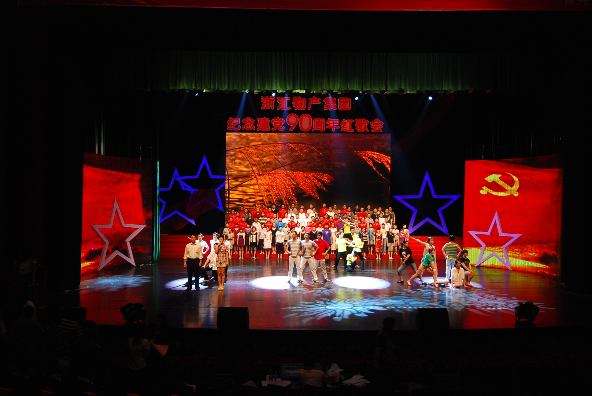 随后,在一段舒展、优美的《红旗颂》舞蹈中,拉开了集团庆祝建党90周年“红歌会”的序幕。高高飘扬的红旗,闪光耀眼的党徽,90年光辉的岁月,唤起了大家难忘的红色回忆。整台晚会分“闪闪的红星”、“我爱你中国”、“春天的故事”3个篇章。《听妈妈讲那过去的事情》将观众带回了那激情燃烧的岁月;《十送红军》表现了长征路上军民之间的鱼水情深;《红军不怕远征难》让人重温了长征的艰难险阻,彰显了革命先辈们艰苦奋斗的精神;《红色娘子军》、《战地之歌》分别唱出了娘子军和游击队员们在不同战场上的英姿。随后,《赞歌献给党》、《生日的礼赞》、《我们走在大陆上》、《咱们工人有力量》、《红色记忆》、《祖国不会忘记》等用不同的方式,歌颂了在共和国不同时期涌现的英雄和他们的感人事迹,反映了新中国各族人民热爱党、热爱社会主义伟大祖国的心声。第三篇章的《走向复兴》,唱出了中华民族在中国共产党领导下,信心满怀,扬帆高歌迈向新胜利的壮志豪情;大型歌舞《在灿烂阳光下》,用铿锵的演唱、动人的伴奏,让激情澎湃在每个人心中;《祝福祖国》则以深情的歌声,打动着在场的每一个人。晚会最后,集团领导班子带领集团全体高管人员,与浙经院学生合唱队组成了大合唱方阵,以饱满的热情、嘹亮的歌声,放声高歌《没有共产党就没有新中国》、《团结就是力量》等经典歌曲,把红歌会的气氛推向了高潮。