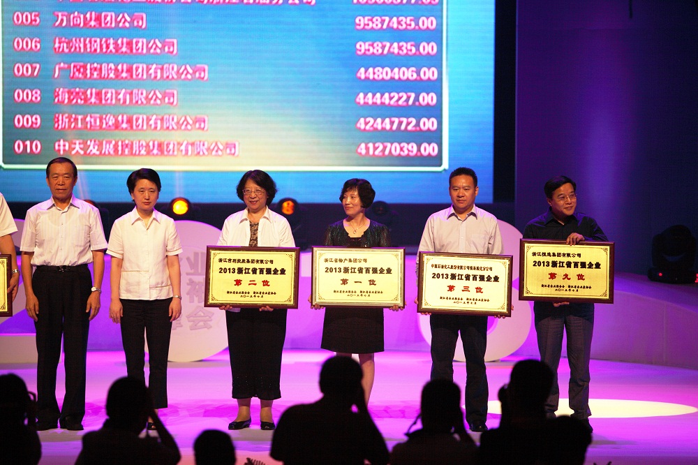 8月28日,浙江省企业联合会、省企业家协会及省工业经济联合会举办的第7次会员代表大会暨“2013浙江省企业领袖峰会”在省人民大会堂隆重举行。会议揭晓了2013年浙江省百强企业及制造业百强、服务业百强企业榜单。我集团以上一年度1968.32亿元的营业收入,位居2013浙江省百强企业首位和服务业百强企业首位。这也是我集团连续第6年蝉联榜首。周冠女总经理(左4)代表集团公司出席会议并领取了奖牌。(阮丹玺/文 魏春/摄)