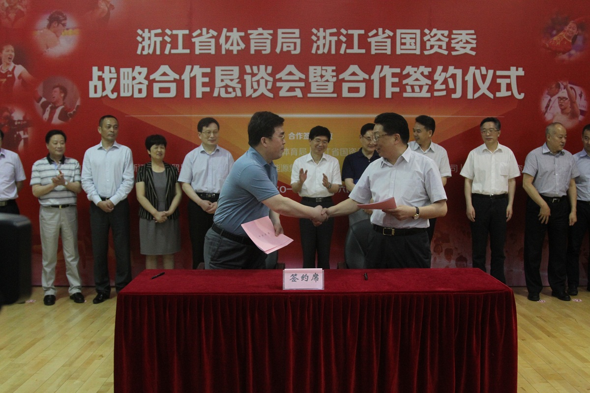 为大力支持我省优秀运动队建设和体育强省建设,5月26日,省国资委与省体育局签署战略合作协议,浙江物产与省体育局签署赞助(捐助)合作协议。协议明确,本着“资源共享、优势互补、互惠互利、合作发展”的原则,在未来4年的合作期内,浙江物产将每年向省体育局所属的运动队提供赞助(定向捐助)人民币200万元;省体育局按照集团指定的名称和运动队进行冠名,并给予集团在开展企业健身活动等方面以支持。此次与省体育局签订赞助合作协议的省属企业还有浙江省国际贸易集团有限公司、浙江省能源集团有限公司、浙江省铁路投资集团有限公司、浙江省交通投资集团有限公司