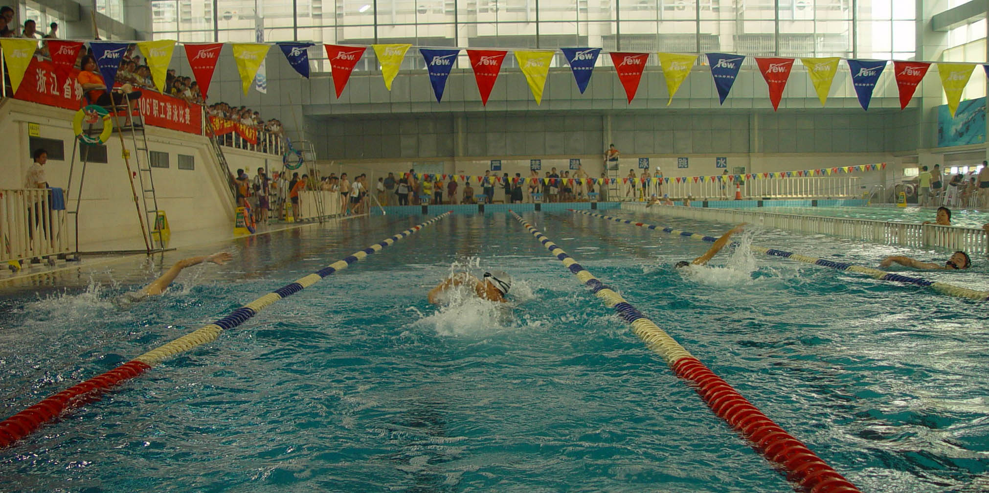 比赛分蛙泳、自由泳,按照性别和年龄段的不同分设11个项目,为体现浙江物产的团队精神,比赛组委会还特设4*50米团体接力项目,集团十家成员单位的近140名员工报名参加了比赛。比赛在热烈的气氛中进行。泳池内白浪翻滚、泳花四溅,运动员们奋勇争先、劈波斩浪,一些曾经受过专业训练的选手为大家展示了精湛的游泳技术,而更多游泳爱好者则展现了浙江物产员工的拼搏精神,和对游泳、对生活的热爱。看台上欢呼声、加油声此起彼伏,拉拉队员们挥舞的小红旗、打出的横幅成了另一道风景。比赛场面紧张激烈,异彩纷呈,选手们发挥了较高的竞技水平,展现了良好的比赛作风,很多项目的竞争呈现白热化,几位选手的成绩差距很小,充分体现了浙江物产员工积极向上的精神风貌。