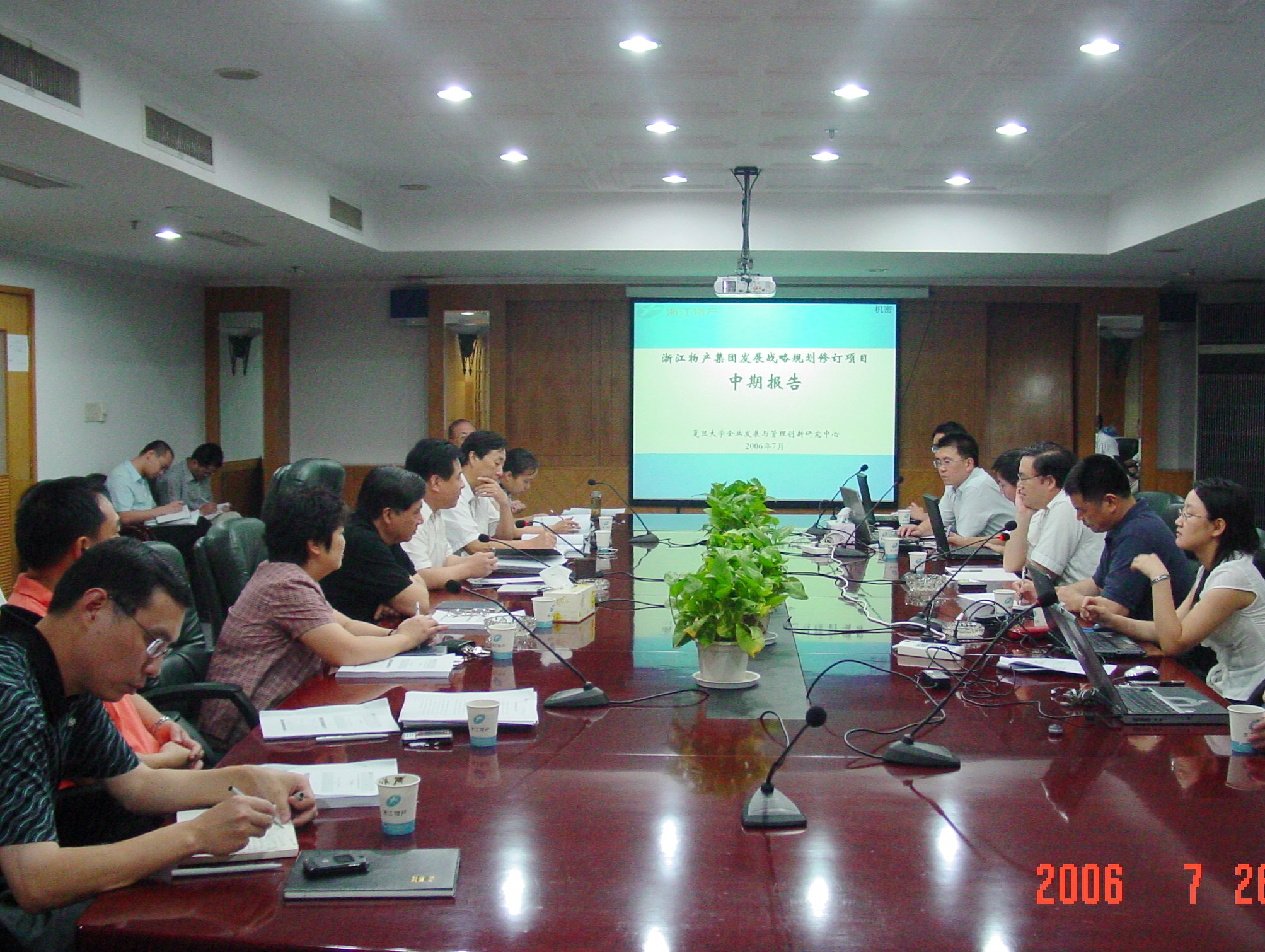 7月26日,集团战略规划修订中期报告会在集团总部会议室举行。集团公司领导和各职能部门负责人认真听取了以芮明杰教授为首的复旦大学课题组有关浙江物产发展战略规划研究修订情况的中期报告,包括战略执行诊断报告、目标规划思路报告、总体战略思路报告、主业板块发展思路报告和实施方案思路报告等。双方并就集团战略发展整体思路、目标定位、商业模式、管理体制、要素配置等进行了进一步深入沟通交流,为战略规划的完善修订奠定了基础。   (本报记者摄)
