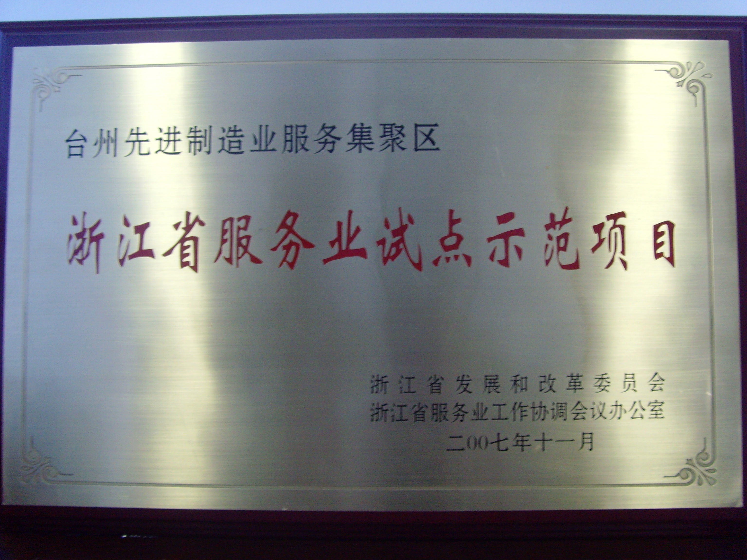 12月4日,在省发改委召开的全省发改系统服务业工作会议上,我集团台州先进制造业服务集聚区项目获得了由省发改委和省服务业工作协调会议办公室联合颁发的“浙江省服务业试点示范项目”牌匾。 (储春银)