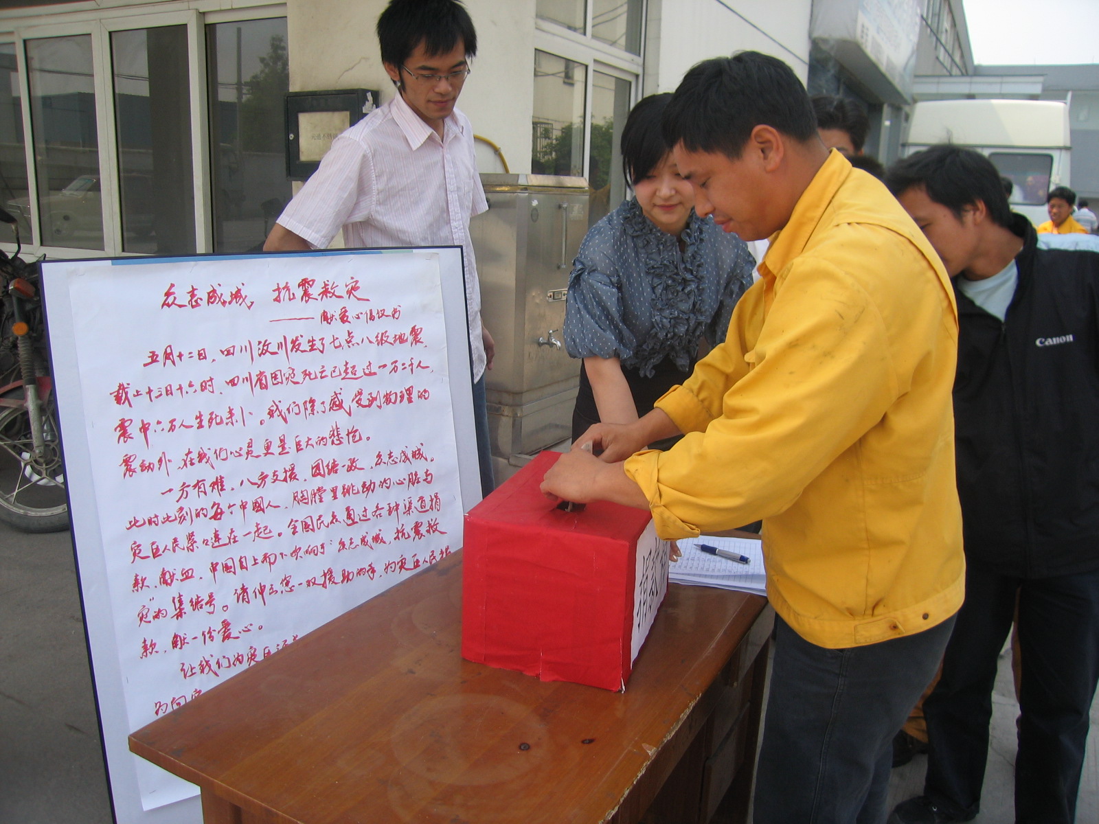 5月16日,是“元通车展”开幕的第一天。在开幕仪式上,主办方物产元通公司特别开设了赈灾捐款环节。公司董事长隋剑光首先代表物产元通向灾区捐款40万元,随后员工代表们也纷纷走到捐款箱前,将一个个装满员工捐款和深深祝福的信封塞进了捐款箱。老同志徐正编长期重病,在得知消息后,委托子女代为转交1000元捐款,为灾区献上爱心。