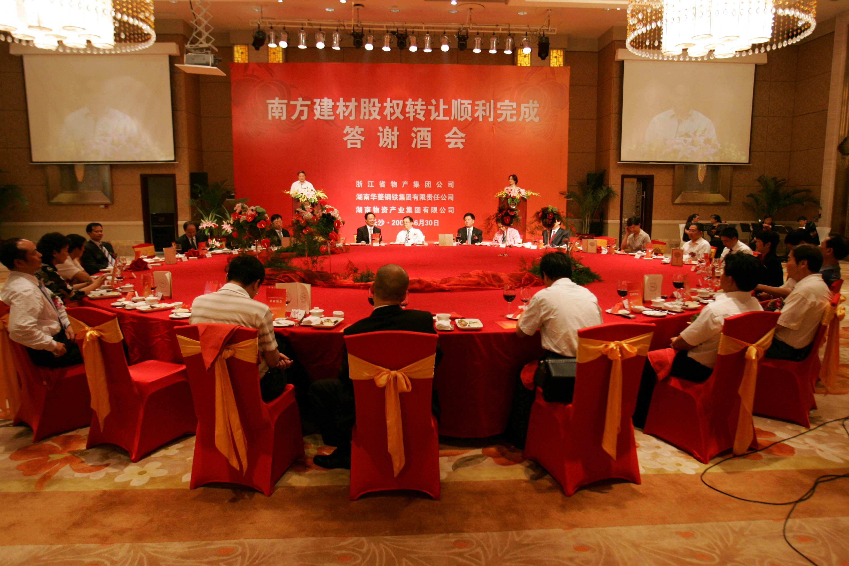 6月30日,南方建材股份有限公司股权转让顺利完成答谢会在长沙喜来登酒店隆重举行。浙江省国资委主任陈正兴、浙江省物产集团公司董事长胡江潮、总经理孟伟林等出席了答谢会,对南方建材股权转让项目的顺利完成表示衷心祝贺。湖南省委副书记梅克保,湖南省政府党组成员、顾问陈德铨,湖南省国资委主任莫德旺、副主任樊建军,湖南省劳动厅副厅长陈益枝、湖南省物资行业事务办公室主任刘平以及华菱钢铁集团董事长李效伟、总经理李建国,同力商贸控股集团董事长陈耀年、总经理周黎明等来自当地党委政府部门、股东单位、金融机构及南方建材业务合作伙伴的社会各界人士出席了答谢酒会。