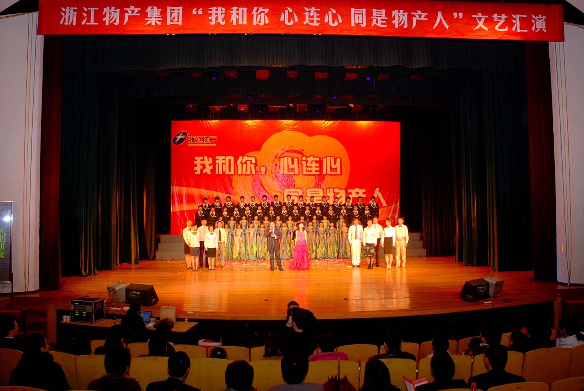 人”青春灵动、快乐多彩的生活;由南方建材股份公司献演的湖南花鼓戏《刘海砍樵》,展现了物产国际10年创业发展的成果和对未来的美好憧憬;物产金属公司的老歌新唱《走向胜利 走向辉煌》,则以新颖的视听形式,暗喻浙江物产面对挑战敢于攻坚克难、开拓创新、不断追求卓越的发展历程和浙江物产人“百折不挠、艰苦创业”的奋斗精神,唱响了全体物产人“流通产业化事业必定胜利,浙江物产再创辉煌”的心中之歌!物产民爆的小合唱《相亲相爱》,表达了物产大家庭“同是一家人”的温馨;物产元通的快板说唱《物产之歌》,以28位青年男女舞动起“青春的翅膀”,来尽情讴歌蒸蒸日上的集团流通产业化事业,表达了“物产元通人”去创造更加美好明天的信心、决心和满怀豪情;由浙经院师生联合排演的歌伴舞《共和国之恋》,展现了学院师生凝聚力量、开拓进取、创造未来的豪迈激情;歌曲与朗诵《越来越好》,则表达了“物产燃料人”对浙江物产事业的热爱忠诚和美好祝愿。演出最后,由集团各成员单位员工共同排演的大合唱《我和你,心连心,同是物产人》,则唱出了一万多名“浙江物产人”心手相连、心心相印、携手共进、共创美好未来的心声,将整台演出推向了高潮。
