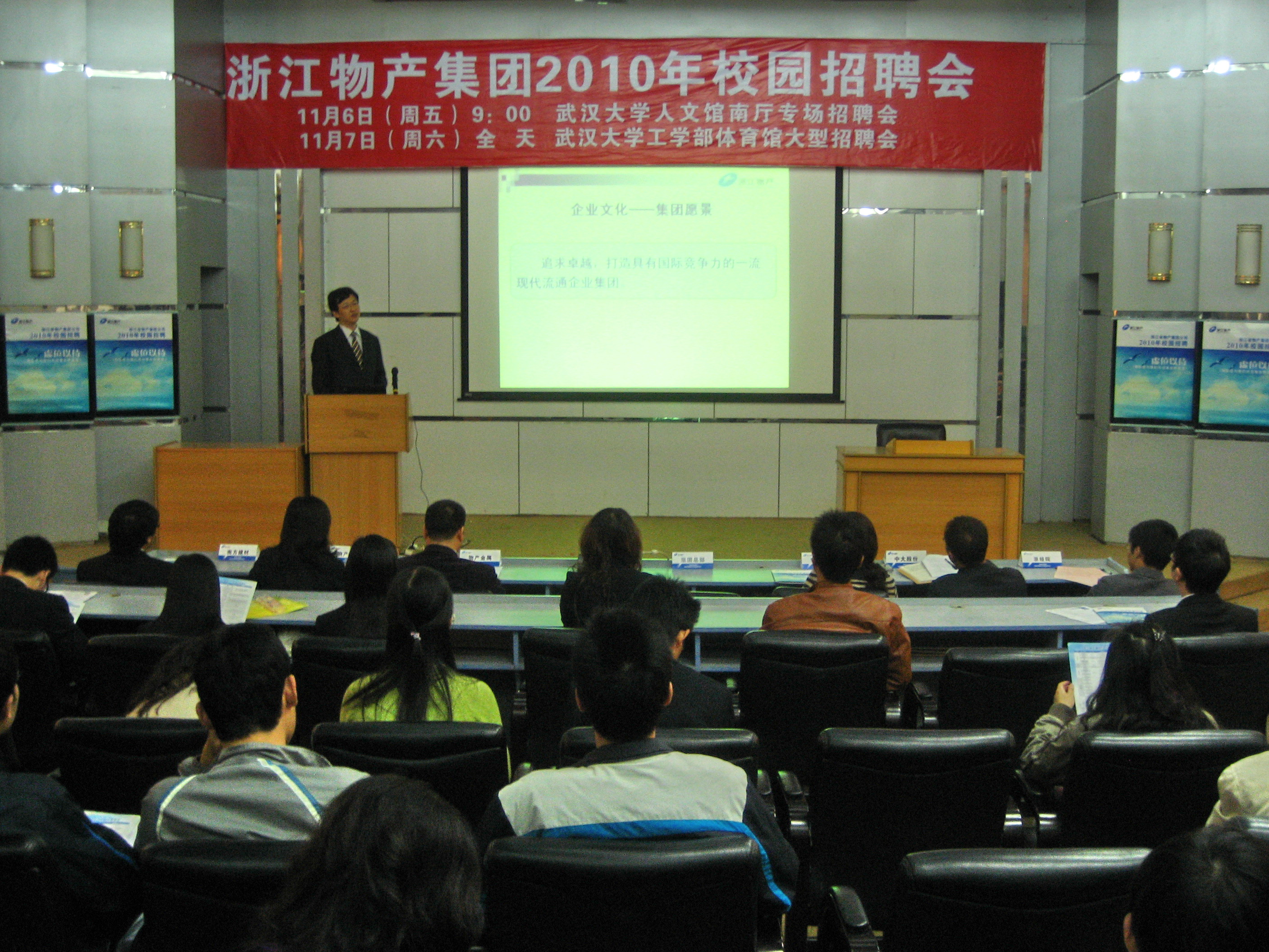 11月上旬和下旬,集团公司先后在在武汉大学和浙江大学圆满举办了两场“浙江物产集团2010校园专场招聘会”,集团下属物产金属、物产元通、物产国贸、中大股份、物产化工、浙经院和南方建材等7家成员单位参与了此次统一招聘,共计推出需求岗位50余个、职数200多位。
