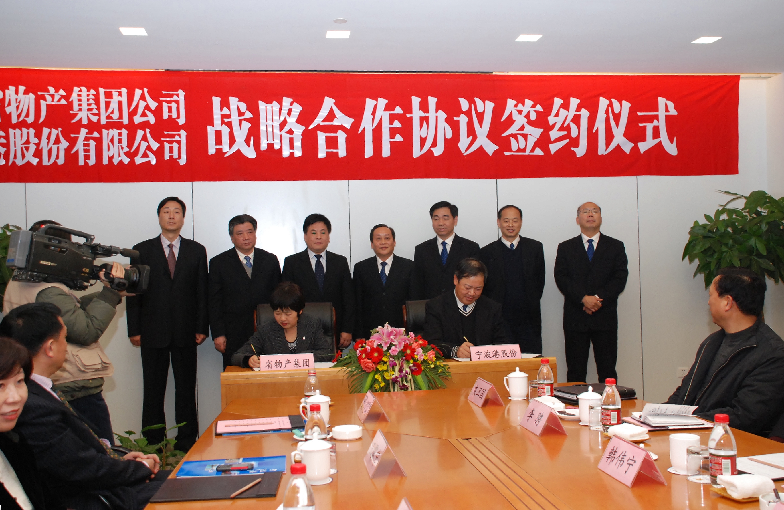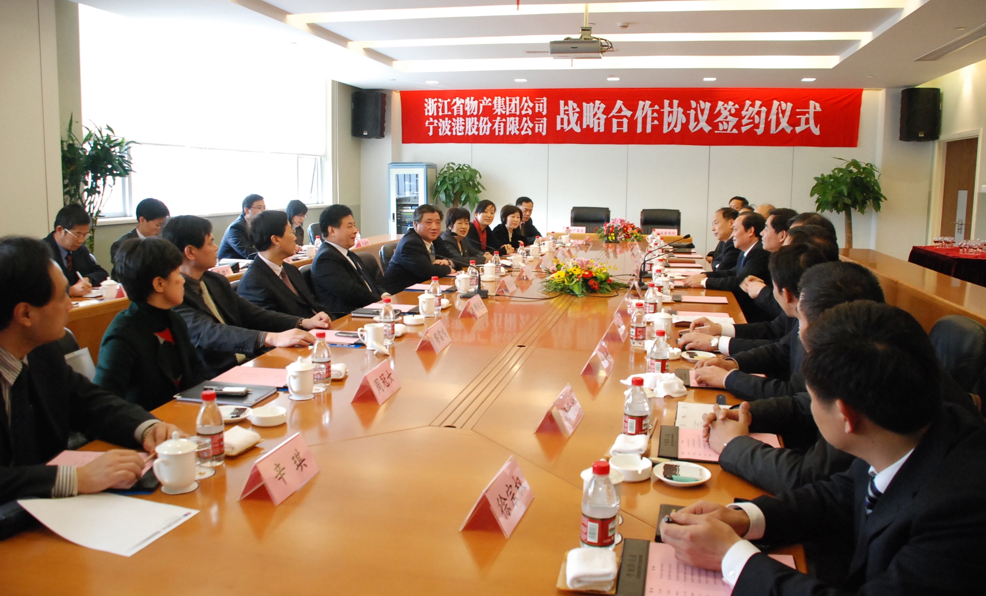 20091216日下午,浙江物产集团与宁波港集团战略合作协议签约仪式在宁波港大厦举行。集团公司领导胡江潮、孟伟林、隋剑光、陈敏以及有关成员公司和总部职能部门负责人,宁波港股份有限公司李令红董事长、闻建耀党委书记、吴金坤总裁、蔡申康副总裁、童孟达总经济师及其相关职能部门和下属公司负责人等出席了签约仪式。陈敏副总经理与蔡申康副总裁分别代表双方共同签署了战略合作协议。此举标志着浙江物产与宁波港长期的全方位的战略合作伙伴关系的良好开端。