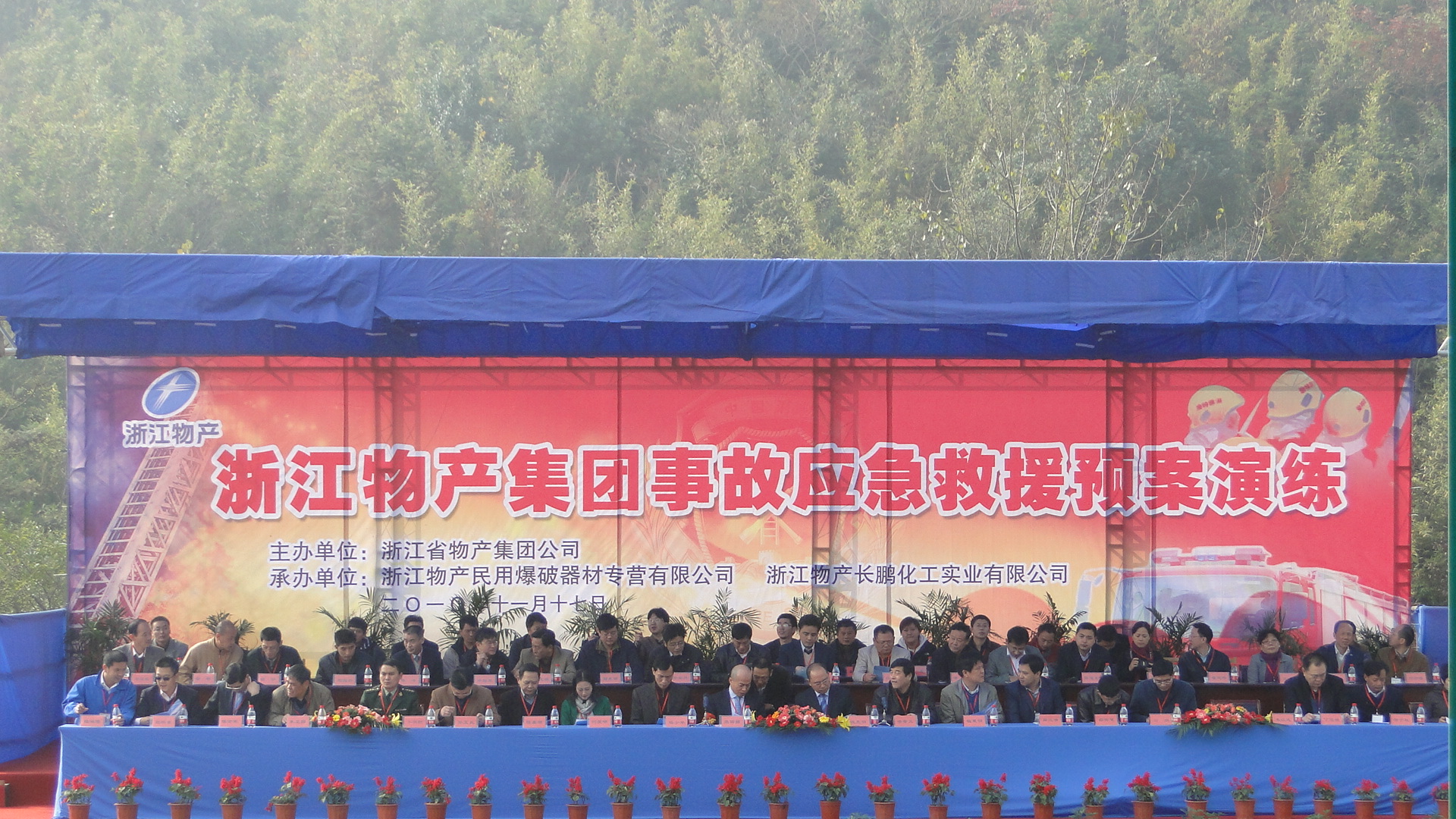 这惊险而紧张的场面,是集团公司精心部署、物产民爆及物产长鹏公司联合承办的一场“事故应急救援预案”演练。集团公司副总经理张国强担任演练现场总指挥,副总经理沈光明担任演练现场副总指挥。省安全生产监督管理局、省国防科工办、湖州市经委、长兴县发改委有关领导,集团总部职能部门负责人,集团成员单位分管安全的领导、职能部门负责人,集团安全生产重点单位负责人等100余人参加了演练观摩。