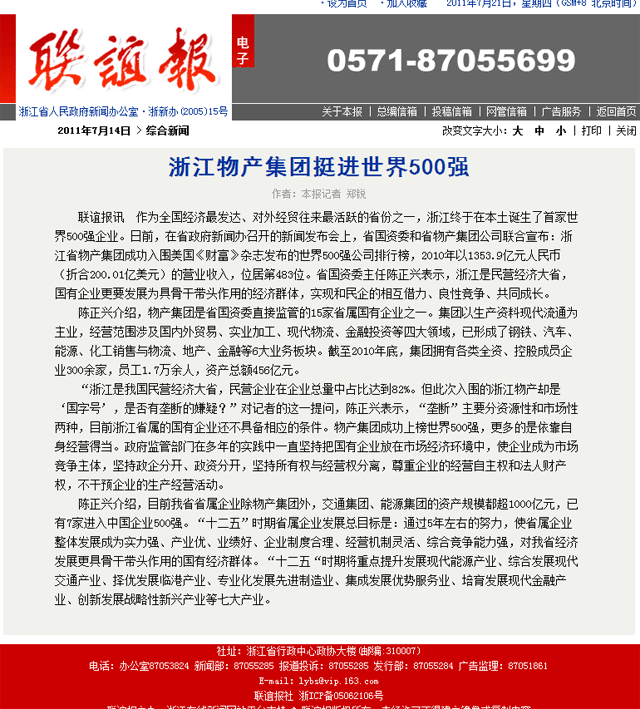 联谊报讯 作为全国经济最发达、对外经贸往来最活跃的省份之一,浙江终于在本土诞生了首家世界500强企业。日前,在省政府新闻办召开的新闻发布会上,省国资委和省物产集团公司联合宣布:浙江省物产集团成功入围美国《财富》杂志发布的世界500强公司排行榜,2010年以1353.9亿元人民币(折合200.01亿美元)的营业收入,位居第483位。省国资委主任陈正兴表示,浙江是民营经济大省,国有企业更要发展为具骨干带头作用的经济群体,实现和民企的相互借力、良性竞争、共同成长。