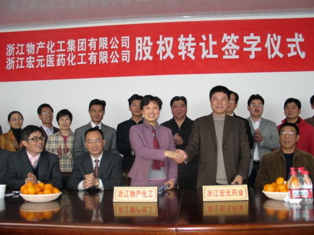 11月28日上午,浙江物产化工集团有限公司和浙江宏元医药化工有限公司股权转让签字仪式在位于台州临海的宏元医药公司会议室举行。物产化工周冠女董事长和宏元医药林世采董事长分别代表双方在协议书上签字。按照协议,物产化工将收购宏元医药60%股份,成为其控股股东。此举标志着物产化工公司正式涉足化工产品生产领域,对推进公司“两化一链”进程具有里程碑式的意义。