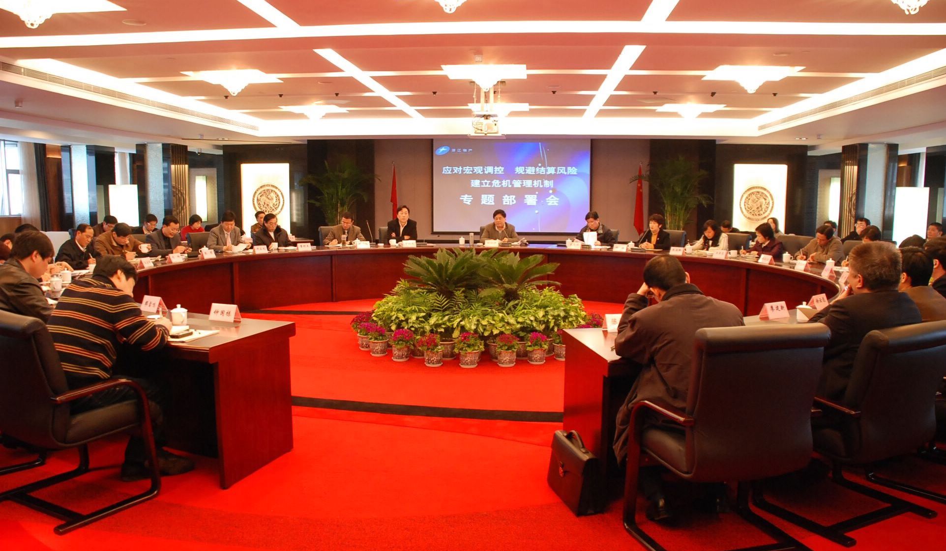 春节刚过,2月15日,集团公司即召集各主要成员公司相关负责人召开专题会议,研究如何正确应对宏观调控,规避结算风险,建立危机管理体系和机制。会议要求集团上下切实增强危机意识,居安思危,逆势应对,顺势而为,通过建立风险防控机制,提升危机管理水平,有效防范经营活动中的各类风险尤其是结算风险,努力实现集团良性、稳健的发展。集团公司董事长胡江潮和总经理孟伟林在会上分别作了针对性部署。