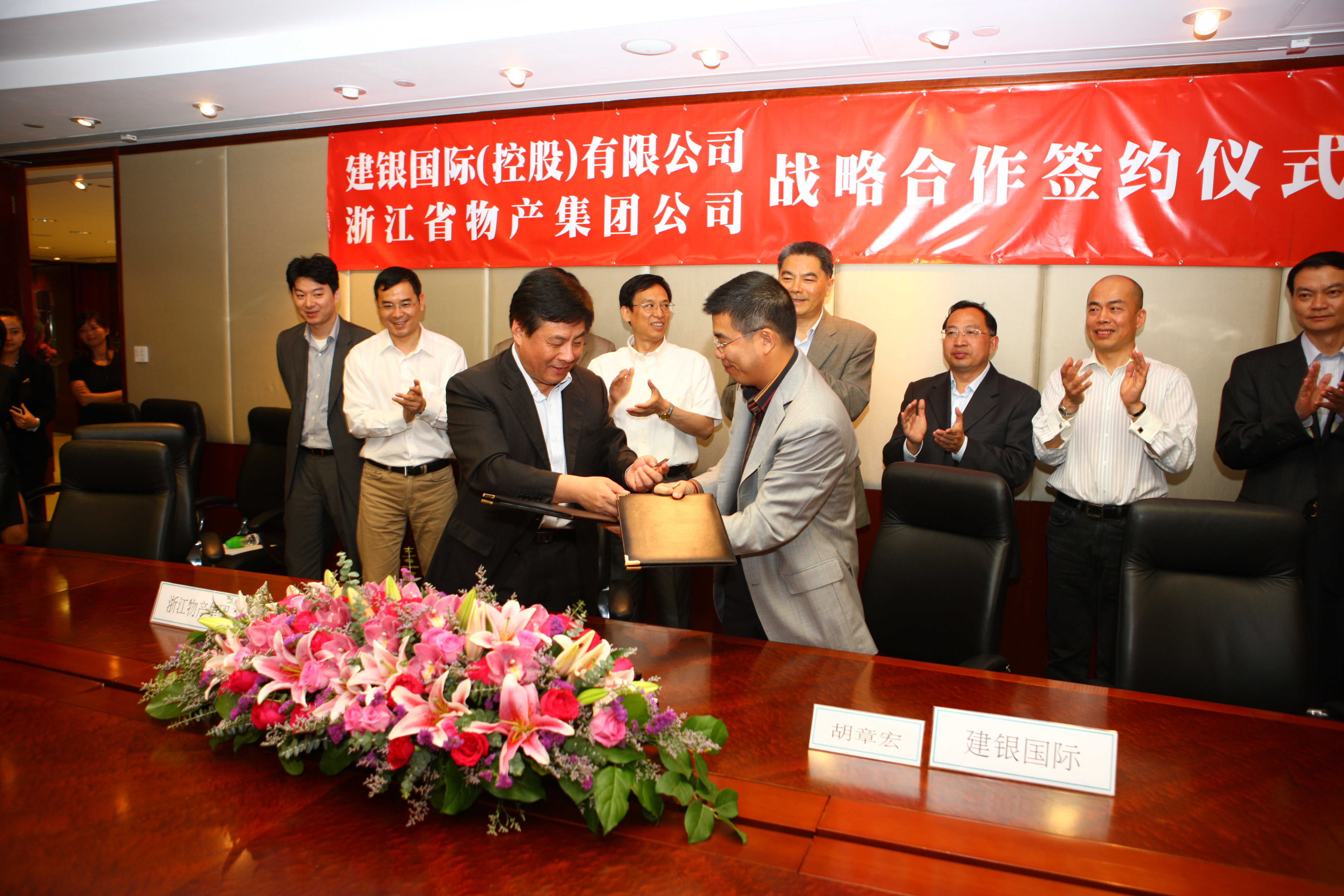 6月12日,浙江物产集团与建银国际(控股)有限公司战略合作签约仪式在香港太古广场建银国际总部隆重举行。浙江省人民政府副省长金德水出席了签约仪式。物产集团公司董事长胡江潮和建银国际CEO胡章宏在战略合作协议上签字,共同开启了双方战略合作的新篇章。