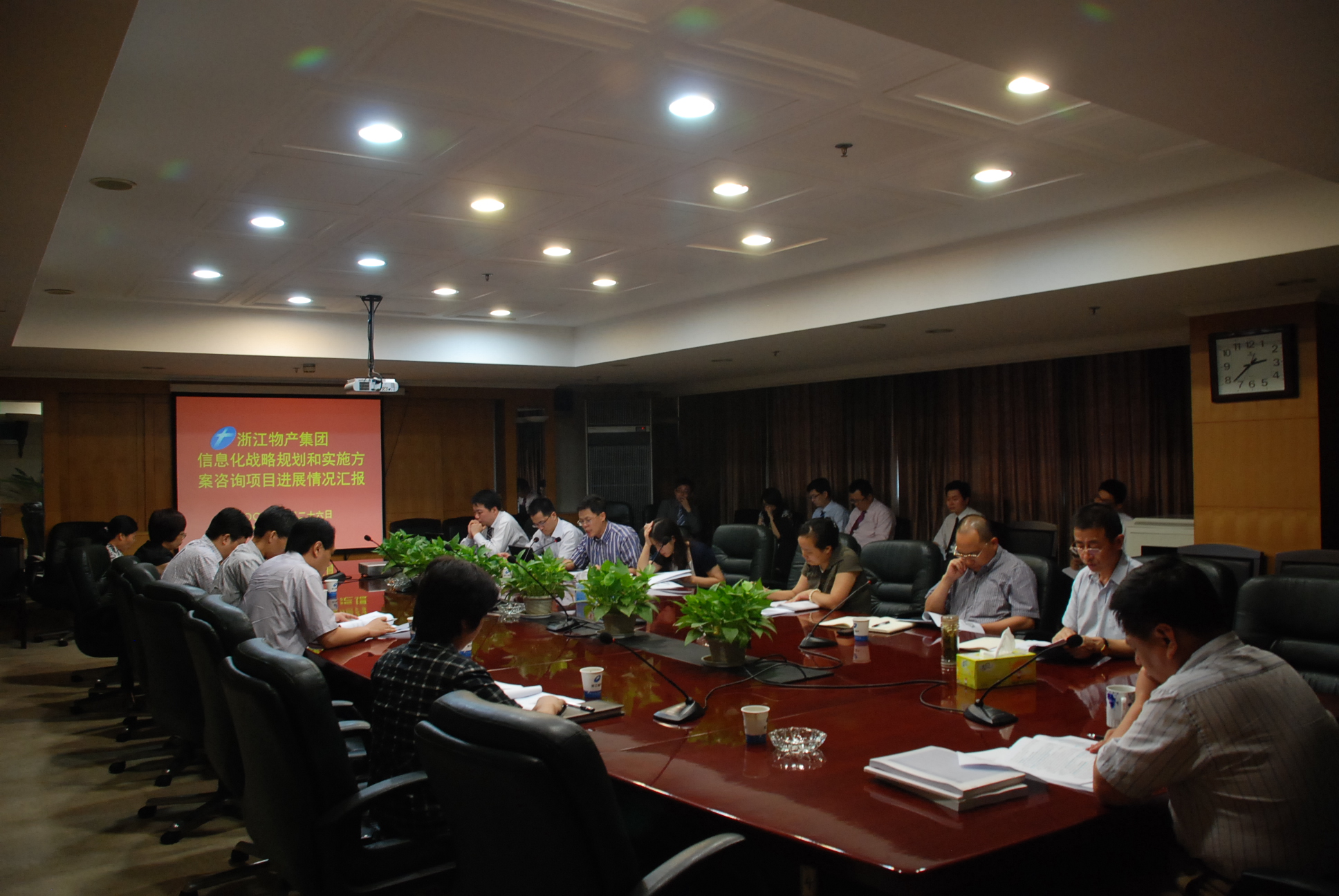 8月26日下午,集团公司召开集团信息化战略规划和实施方案咨询项目专题会议。集团公司董事长胡江潮,集团公司副总经理陈敏、胡仲鸣、沈光明,财务总监陈满娜,以及集团总部各职能部门负责人等参加会议,会议由集团信息化建设领导小组副组长沈光明副总经理主持。会议听取了集团信息化咨询项目组和德勤公司关于《浙江物产集团信息化战略规划和实施方案咨询项目规划方案及项目进度》的情况汇报,对集团信息平台规划方案进行了讨论研究。